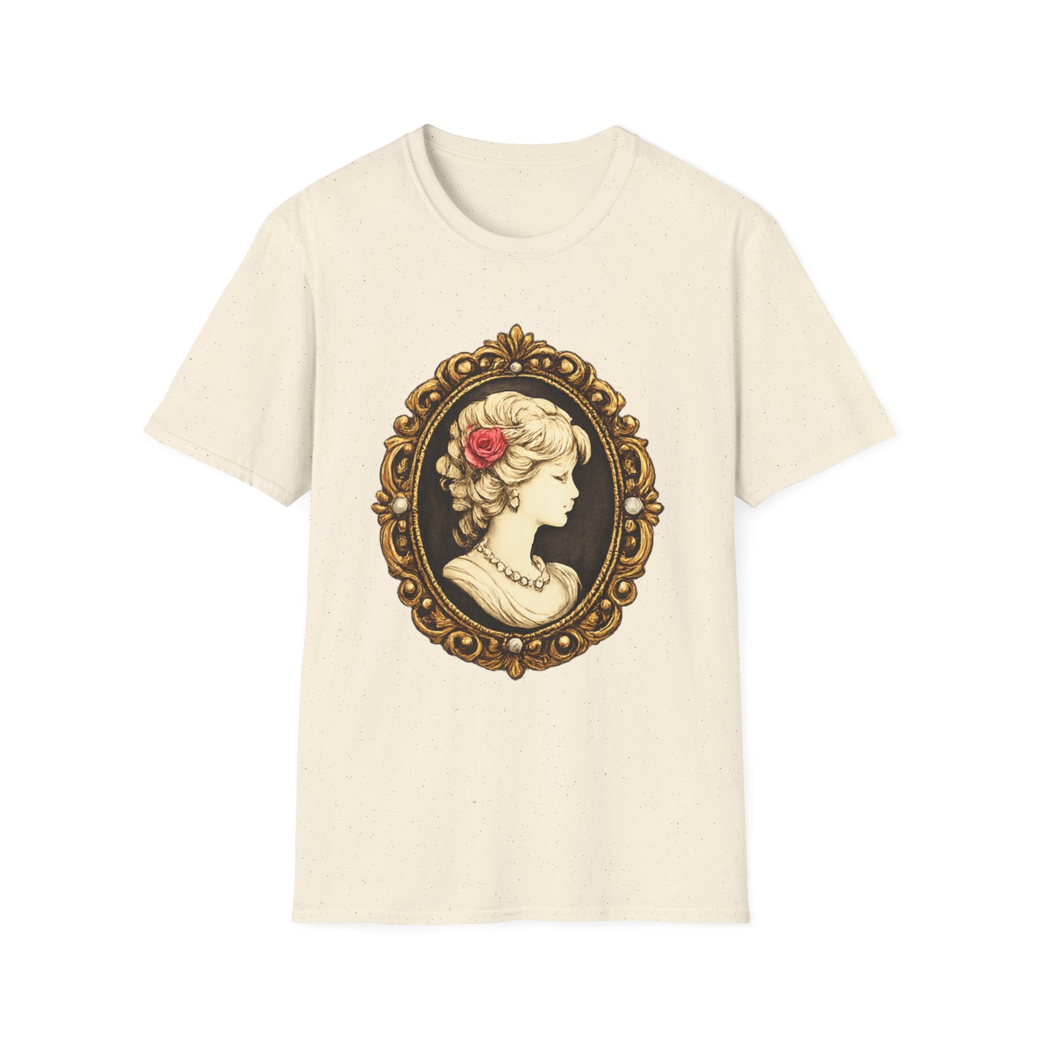 This lightweight crew-neck tee brings a vintage cameo to the everyday. The soft, ring-spun cotton drapes easily, letting the ornate frame and profile portrait become the quiet focal point of your outfit. Wear it layered under a cardigan for slow afternoons at the café, or loose with jeans for wandering through flea markets and bookshops. The muted tones and antique styling sit comfortably in wardrobes that favor heritage details and lived-in charm — it reads like a piece of memory you can fold into a drawer and reach for when you want to feel a little softer, a little steadier.